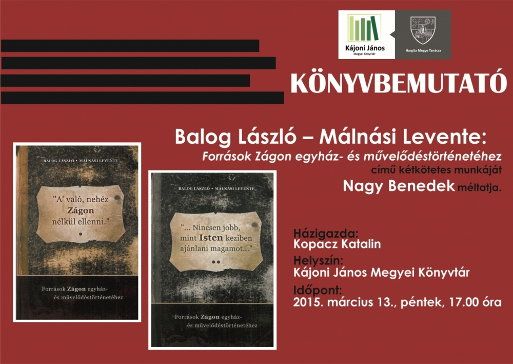 A Kájoni János Megyei Könyvtár előadótermében 2015. március 13-án, pénteken délután 17 órakor Balog László és Málnási Levente: Források Zágon egyház- és művelődéstörténetéhez című kétkötetes munkáját mutatják be. A kötetet Nagy Benedek méltatja, a bemutatóra várják a régiónk művelődéstörténete és a helytörténeti kutatások iránt érdeklődő közönséget.