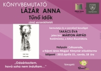 Lázár Anna Tűnő idők című verseskötetének bemutatójára kerül sor 2015. április 15-én, 18 órától a Kájoni János Megyei Könyvtár előadótermében. A bemutatón jelen lesz Márton Árpád képzőművész, a kötet illusztrátora. A verseskötetet Takács Éva mutatja be, és beszélget a szerzővel.