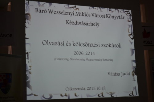 Kétnapos szakmai-tudományos konferenciának adott otthont 2015. október 14-15-én a csíkszeredai Kájoni János Megyei Könyvtár. A Könyvtárak a minőségért címmel szervezett szakmai tanácskozás a Bethlen Gábor Alap és a Communitas Alapítvány támogatásával valósult meg, a Romániai Magyar Könyvtárosok Egyesülete (RMKE), a Kájoni János Megyei Könyvtár és Hargita Megye Tanácsa szervezésében a VI. Székelyföld Napok programsorozatának keretében.