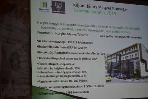 A Romániai magyar könyvtárosok XII. vándorgyűlését és szakmai konferenciáját 2017 október 19-20. között szervezték meg Parajdon a VIII. Székelyföld Napok rendezvényeinek sorában. A hazai magyar könyvtári szakma legnagyobb hagyományos rendezvénye a vándorgyűlés, amelyet érdekképviseleti szervezetük, a Romániai Magyar Könyvtárosok Egyesülete (RMKE http://www.bcucluj.ro/rmke/) szervez. A Kájoni János Megyei Könyvtár társszervezőként csatlakozott idén is az egyesülethez (www.konyvtar.hargitamegye.ro).