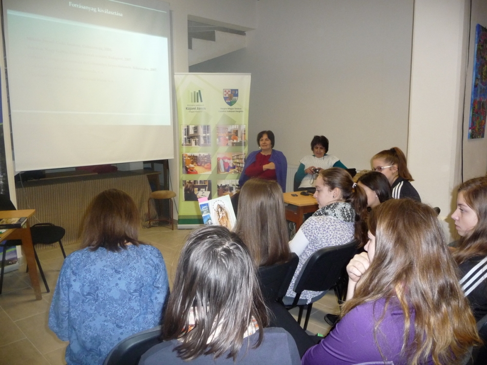 Activitatea de bibliotecă cu elevii clasei a opta B. a Şcolii Generale "Nagy Imre" a avut loc în data de 17 ianuarie 2014. Tema activităţii a fost cunoaşterea enciclopediei Wikipedia, şi referinţele cu privire la istoria culturală locală.